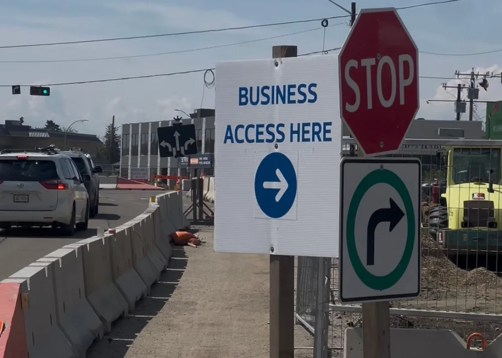 Traffic detours directing drivers to businesses, due to construction along Stony Plain Road